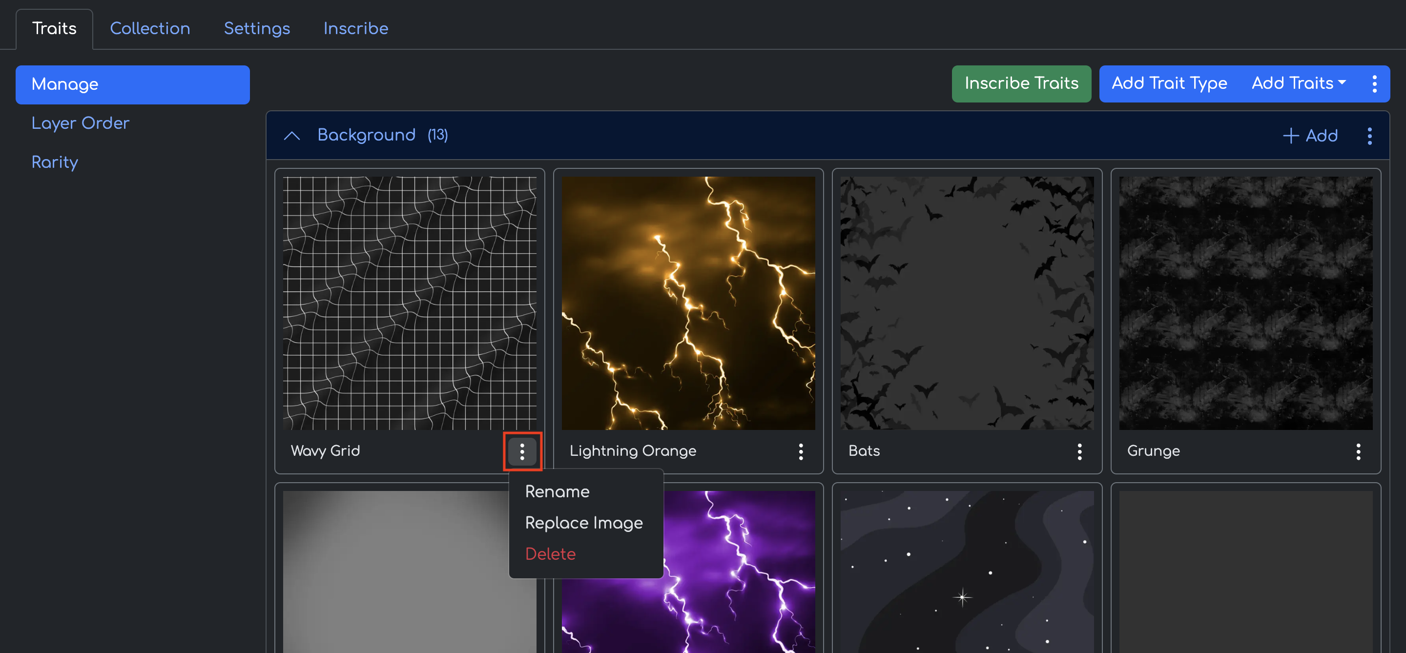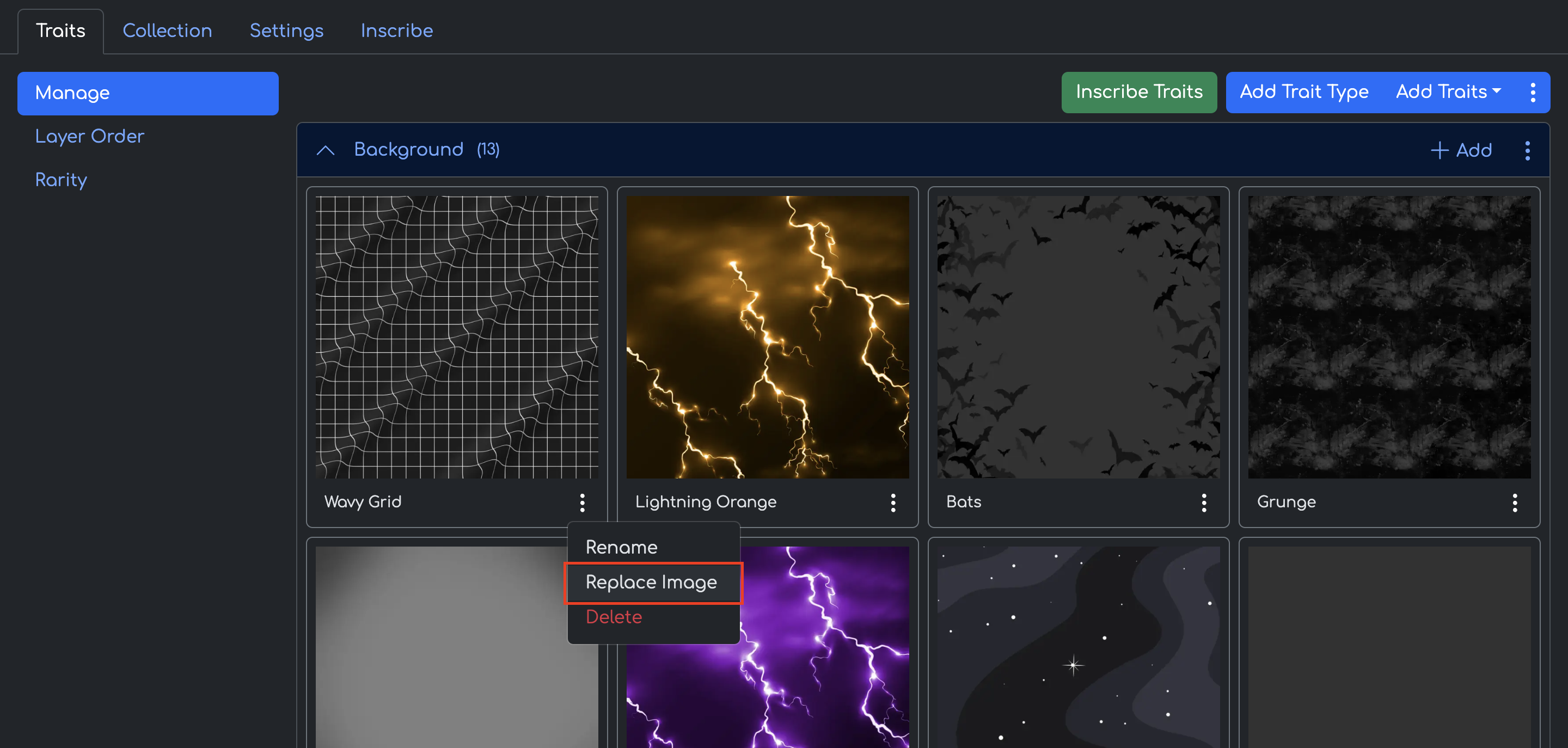 <figure><img src="https://458341126-files.gitbook.io/~/files/v0/b/gitbook-x-prod.appspot.com/o/spaces%2FrOSnB5vqx0dRfYYD0nUg%2Fuploads%2FtLDL2U5hwa4wcNN9l0lf%2Freplace%20image.png?alt=media&#x26;token=e266ecc5-aacc-461a-80fc-0302be8cd4fd" alt=""><figcaption><p>To replace the image for a trait, click <strong>Replace Image</strong> In the <strong>More Actions</strong> menu for the trait</p></figcaption></figure>