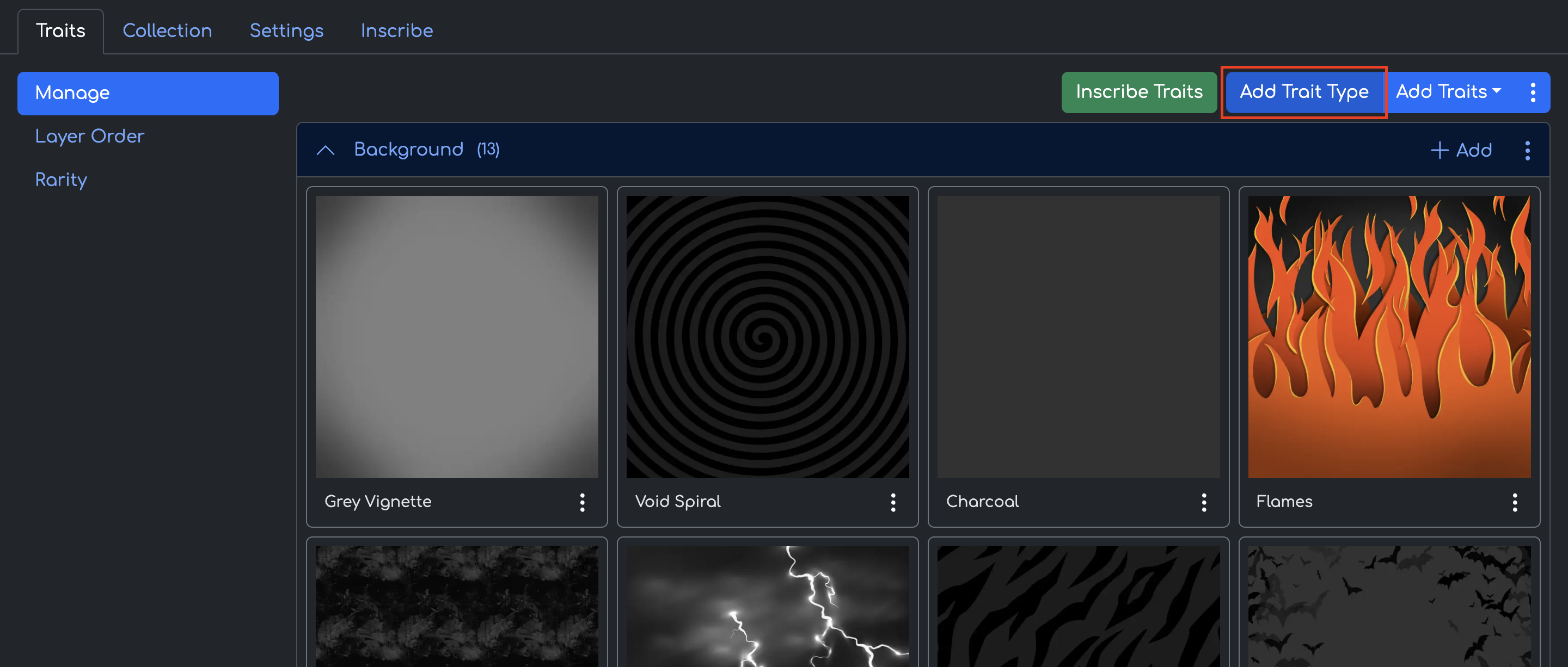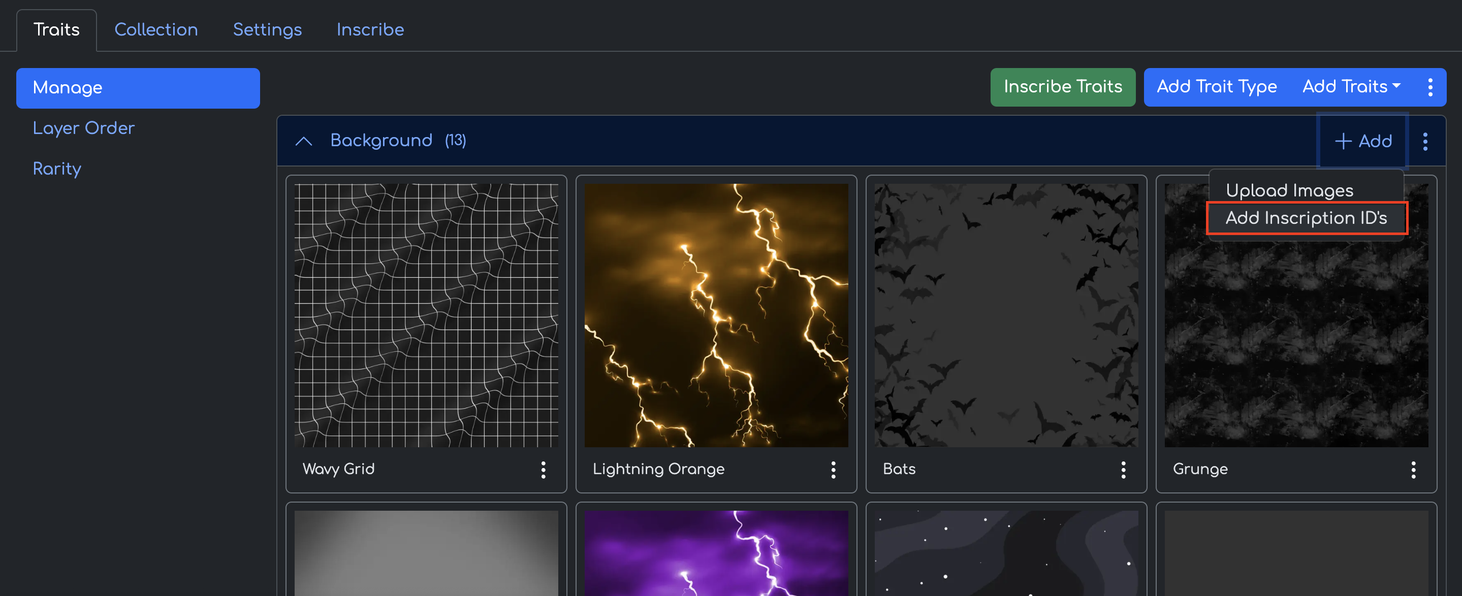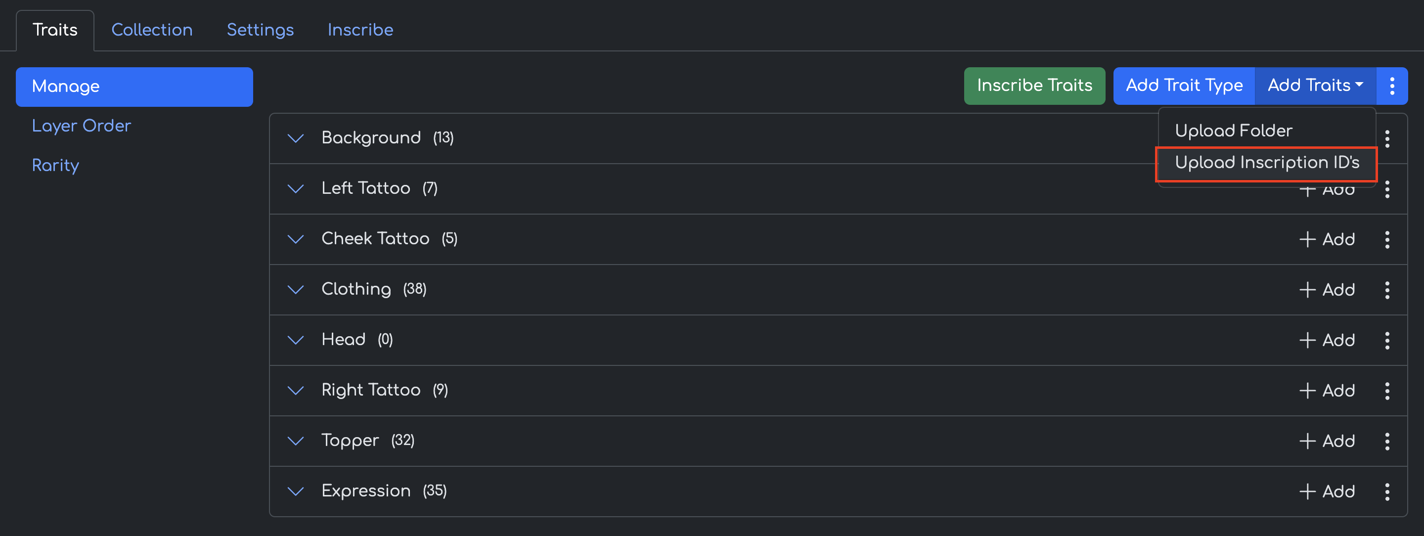 <figure><img src="https://458341126-files.gitbook.io/~/files/v0/b/gitbook-x-prod.appspot.com/o/spaces%2FrOSnB5vqx0dRfYYD0nUg%2Fuploads%2FQ1MNOpWqwhU2M3fjkekn%2Fadd%20inscription%20ids%20to%20trait%20type.png?alt=media&#x26;token=4f594a3e-67c6-41e4-9bf5-ee79a20a48ff" alt=""><figcaption><p>Add Inscription ID's by clicking <strong>Add > Add Inscription ID's</strong> on the header of the trait type you want to add traits to</p></figcaption></figure>