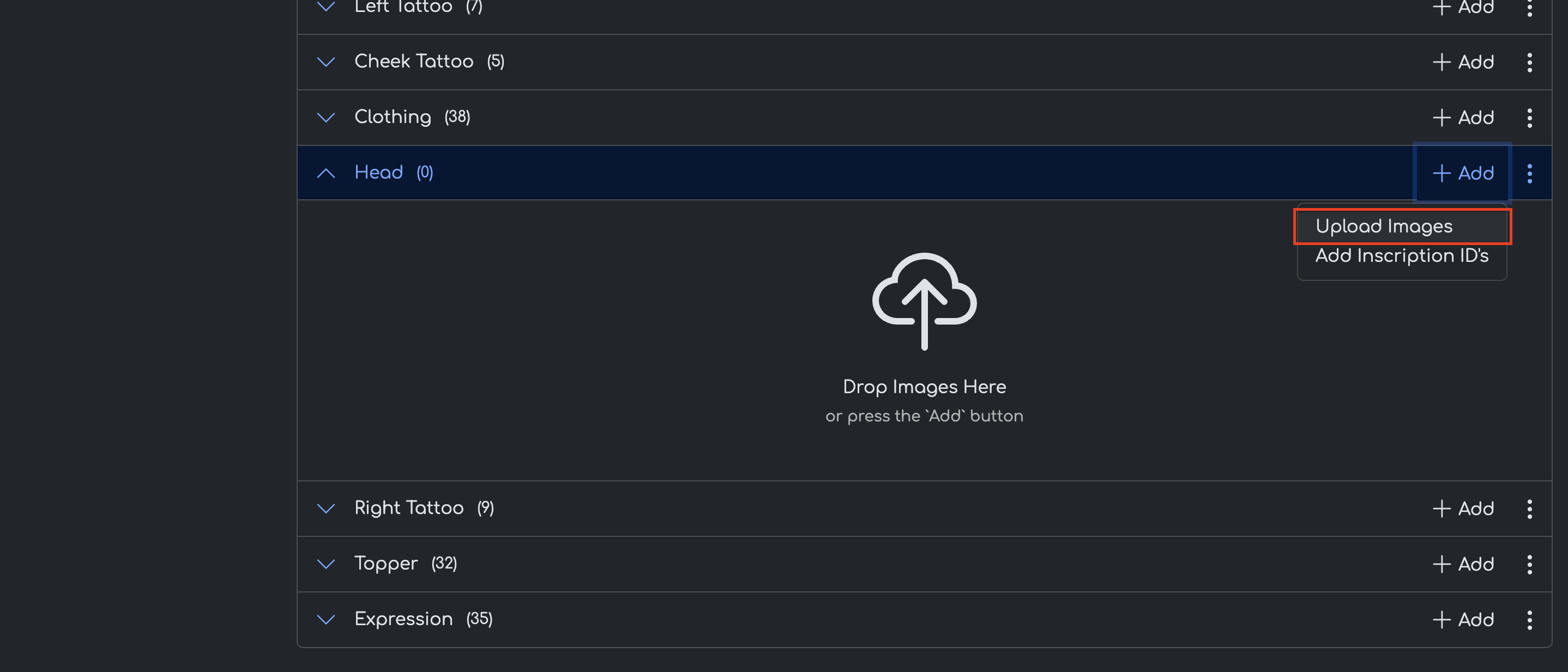 Traits can then be added to the trait type by dragging and dropping images onto the trait type, or clicking the **Add > Upload Images** button located to the right of the trait type you want to add traits to.