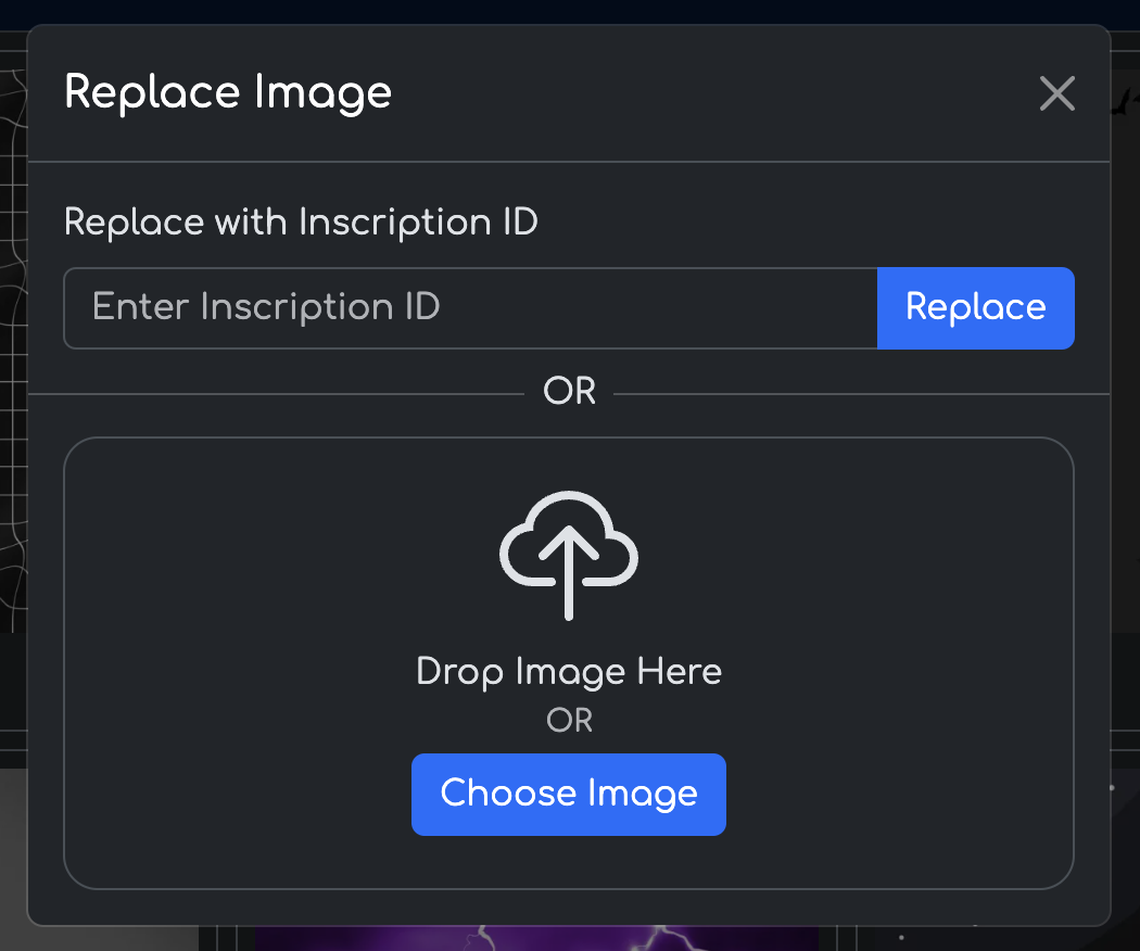 <figure><img src="https://458341126-files.gitbook.io/~/files/v0/b/gitbook-x-prod.appspot.com/o/spaces%2FrOSnB5vqx0dRfYYD0nUg%2Fuploads%2Fe5WrYNSSAzcrIbK063Q3%2Freplace%20image%20modal.png?alt=media&#x26;token=3a348195-c0de-4ac8-b515-92df7e76d30d" alt=""><figcaption><p>Images can be replaced with a file, or the Inscription ID of an already inscribed image</p></figcaption></figure>