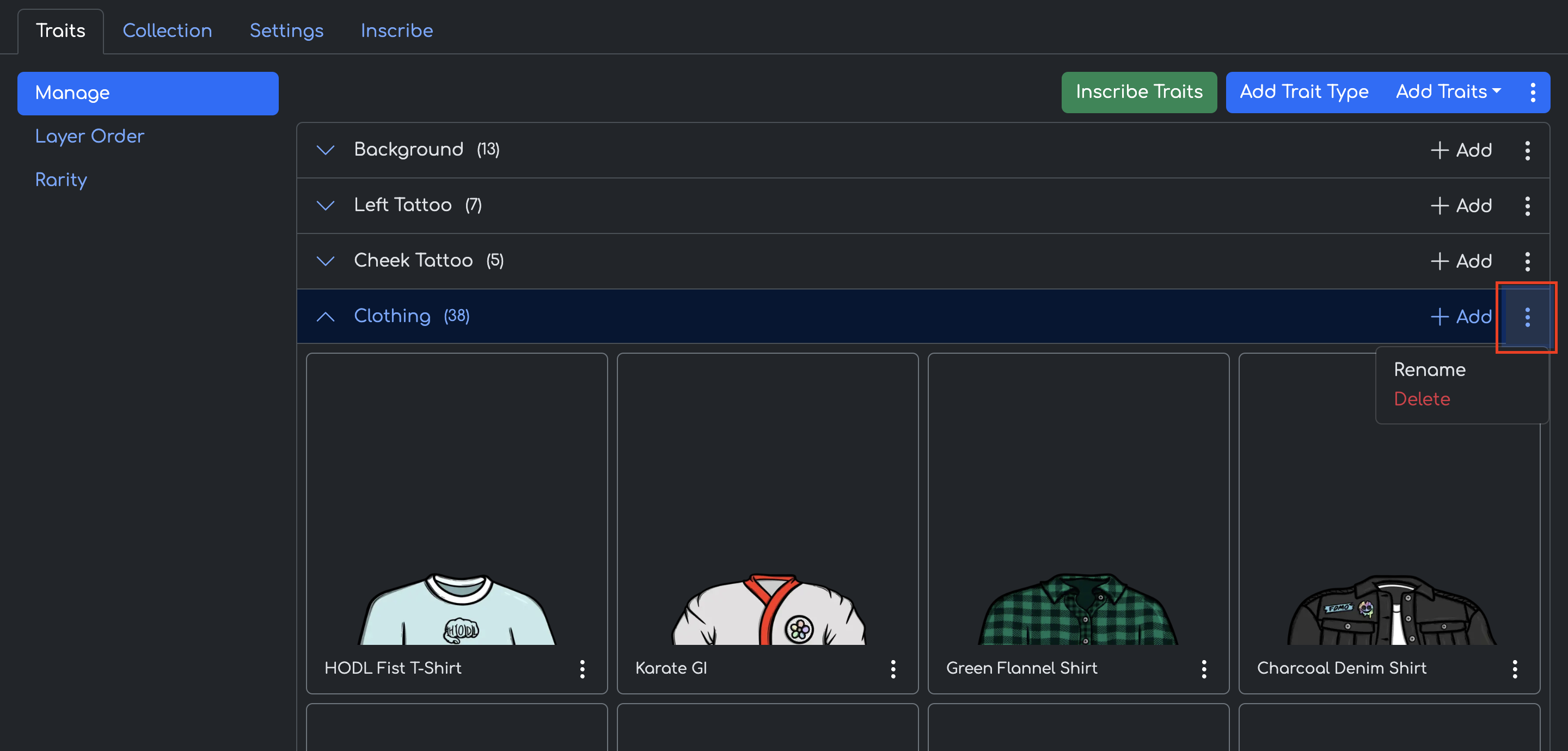 Trait types can be renamed by clicking on the name of the trait type, or by clicking the **More Actions > Rename** button. Under the **More Actions** menu, you can also delete the trait type. Be careful though, deleting a trait type will also delete all the traits within that group. The **More Actions** menu can be found to the right of the trait type, the button with the 3 dots (**⋮**) as highlighted below.