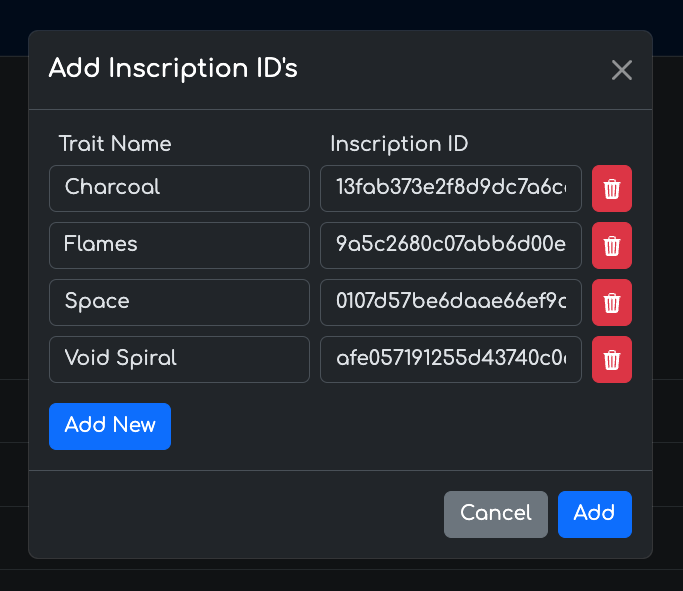 This will open a dialog window as shown below. Enter the name and Inscription ID for each of the traits you're adding. You can add as many or as few traits as you wish. To add extra rows, click the **Add New** button, allowing you to enter in more traits. Alternatively, you can click the **Delete** buttons on the right to remove a trait. When you're done, click the **Add** button to add them to the trait type.