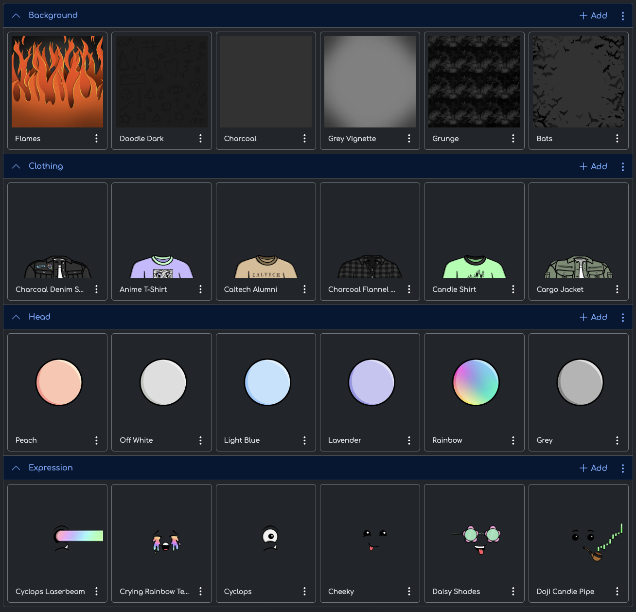 Before uploading your traits, you should sort them into folders based on trait type. Below is an example of how to organise the traits. The names of the folders (Background, Clothing, Expression and Head) are the names of the trait types, while the names of the images are the names of the traits (Bats, Charcoal, Doodle Dark, etc.). The names of the folders and files are important, since GeneratOrd uses these to name your trait types and traits, which will also then appear on market places.