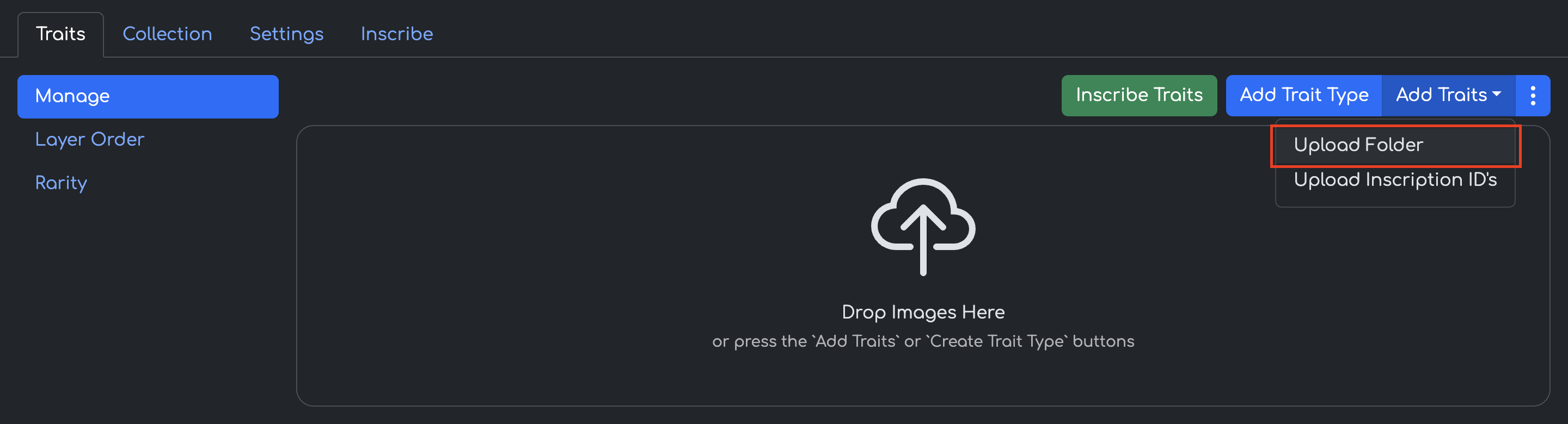 <figure><img src="https://458341126-files.gitbook.io/~/files/v0/b/gitbook-x-prod.appspot.com/o/spaces%2FrOSnB5vqx0dRfYYD0nUg%2Fuploads%2FxjcKsjad9vvUkTfCPdBr%2Fupload%20folder.png?alt=media&#x26;token=66b69583-d937-47c1-a339-586e31d100d3" alt=""><figcaption><p>Upload your traits by dragging and dropping them, or clicking Add Traits > Upload Folder to select the folder from the file system</p></figcaption></figure>